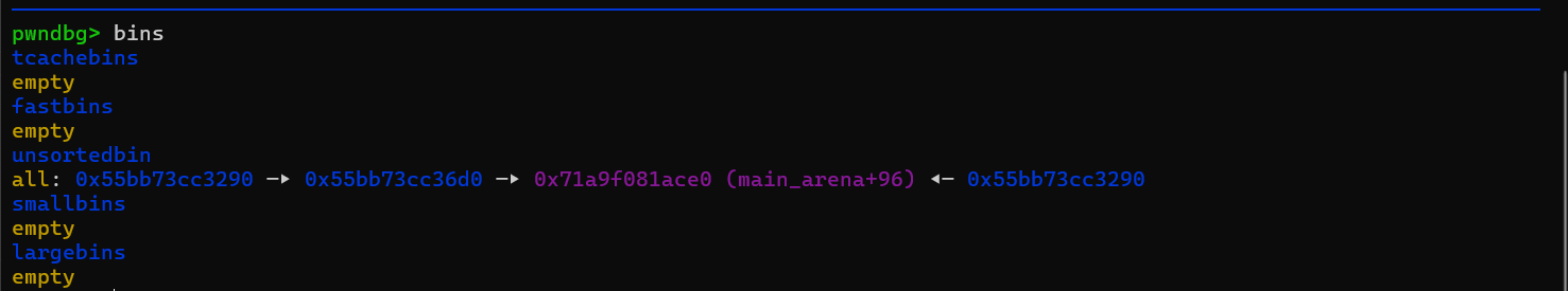 效果就是这样,往 _IO_list_all 上写一个堆地址,相当于直接劫持了 stdout 然后是修复一下用来进行 large bin attack 的堆块,将其申请回来