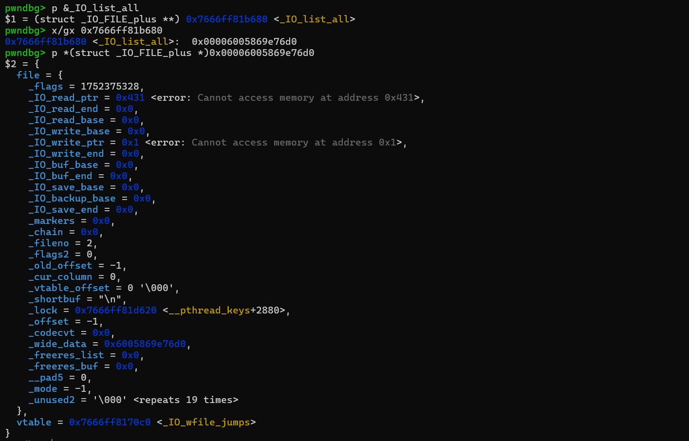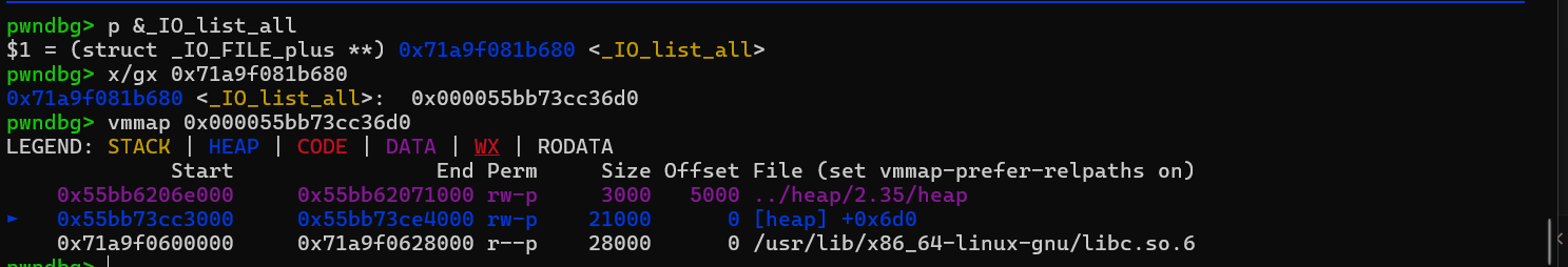 LitCTF 2024_heap-2.35 2.35 相比之前貌似是把 __malloc_hook 和 __free_hook 取消掉了,然后就是 heap 地址多了个 key,就是说不能像 2.27 和 2.31 那样随意 uaf 申请堆块到任意地址了,但问题不大,稍微泄露一下就可以。这题直接学一下 house of apple 吧。需要先掌握一点 io file 的知识,可以先去学学 pwn college 的 File Struct Exploits 大概是到 level 10 的样子。接着参考 gets ✌的视频 house of apple2之_IO_wfile_overflow 。基本上就是参考他的视频里面的 exp。 首先是泄露 libc 和 heap_base