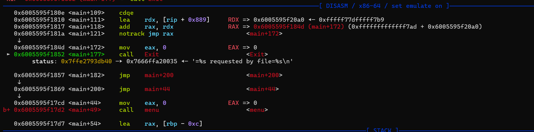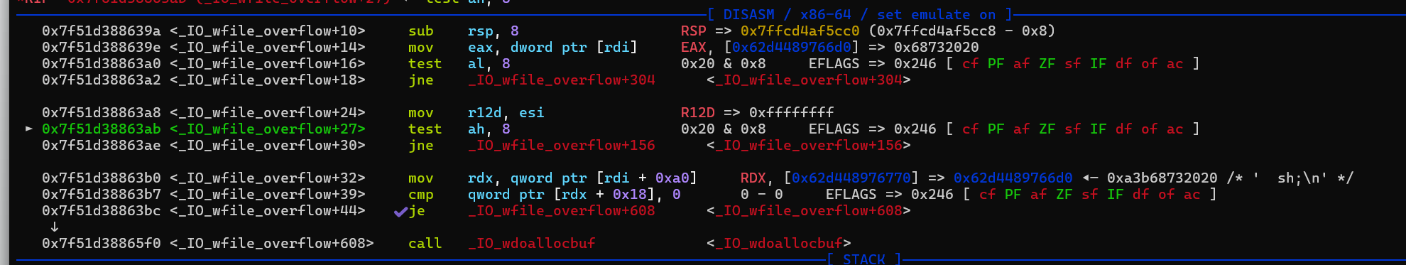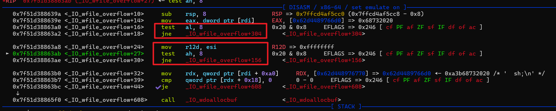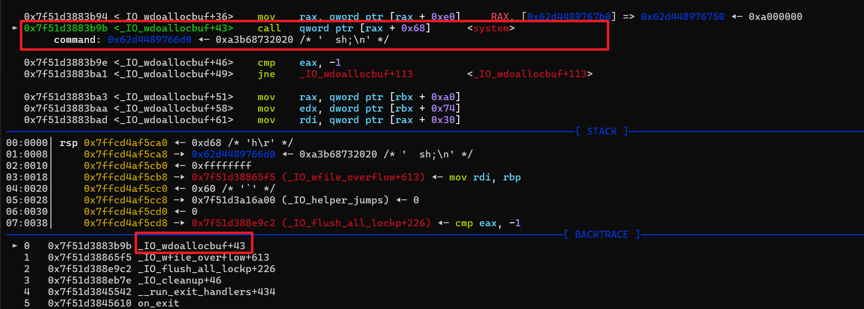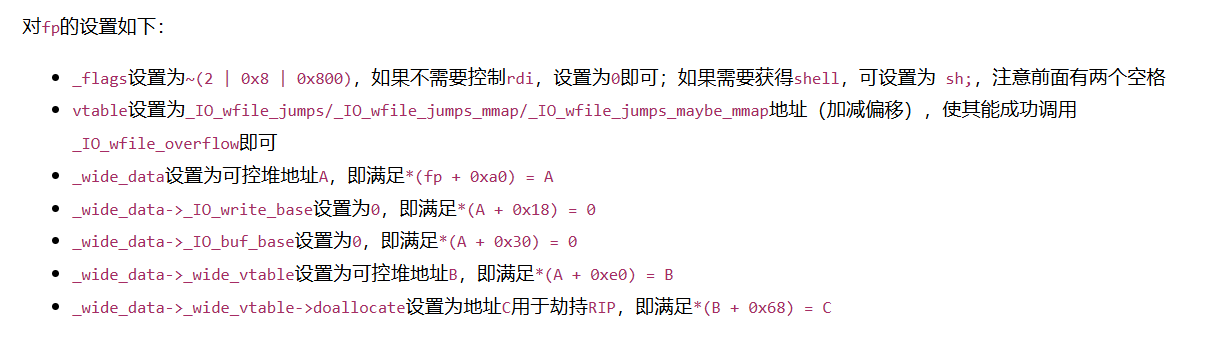 大概来看一下我们伪造的结构体 然后稍微来验证一下上面的条件,_wide_data 设置为 A 继续看一下 B(A + 0xe0),实际上就是倒数第二句的 fake_io += p64(wide_vatable_addr), 直接看 B + 0x68 正是 libc 中的 system。然后 gdb 跟着走一遍,首先是程序中写的 Exit 函数,当中会调用 exit(0) 然后到 _IO_flush_all_lockp 中调用 _IO_wfile_overflow ,然后紧接的是 _IO_wdoallocbuf 但是这里需要注意的是这两个地方,取了我们设置的 flag 字段,也就是提前设定的参数的头两个字节,这里是两个空格 ,test al,8 的意思是看二进制的第四位是否为 1,是就跳转,因为空格 ascii 是 0x20,所以就不会跳转,一开始看 gets 佬的视频,看到他设置的是 ;sh;,第二个字符为 ;(0x3b 0011 1011) 就会跳到 _IO_wfile_overflow+156 那边,从而不会执行下面的 call _IO_wdoallocbuf 然后进入到 _IO_wdoallocbuf 之后就会执行 B + 0x68 上的内容,并且参数就是 _flag 字段的内容 House of apple 2 基本上就是这样了,但如果有限制申请堆块的大小可能就不太好用。 exp就不放了,跟2.39的基本一样。