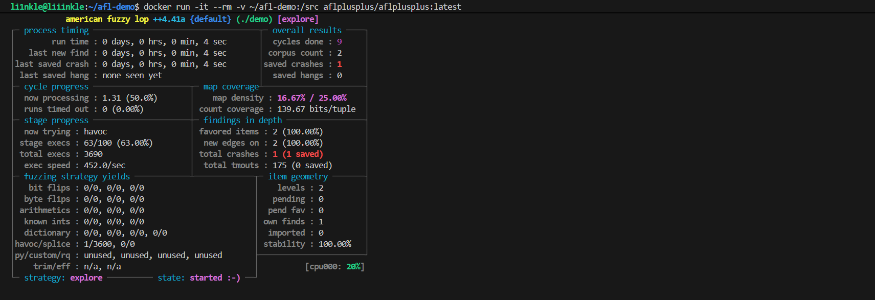 docker run -it --rm -v ~/afl-demo:/src aflplusplus/aflplusplus:latest |