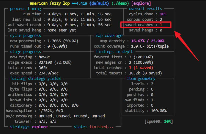 它是不会自动停止的, 这里大概跑了11min, saved crashes 变为了1, 说明有一个样例导致这个程序崩溃了.