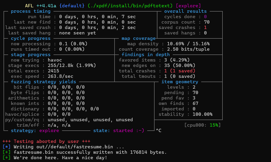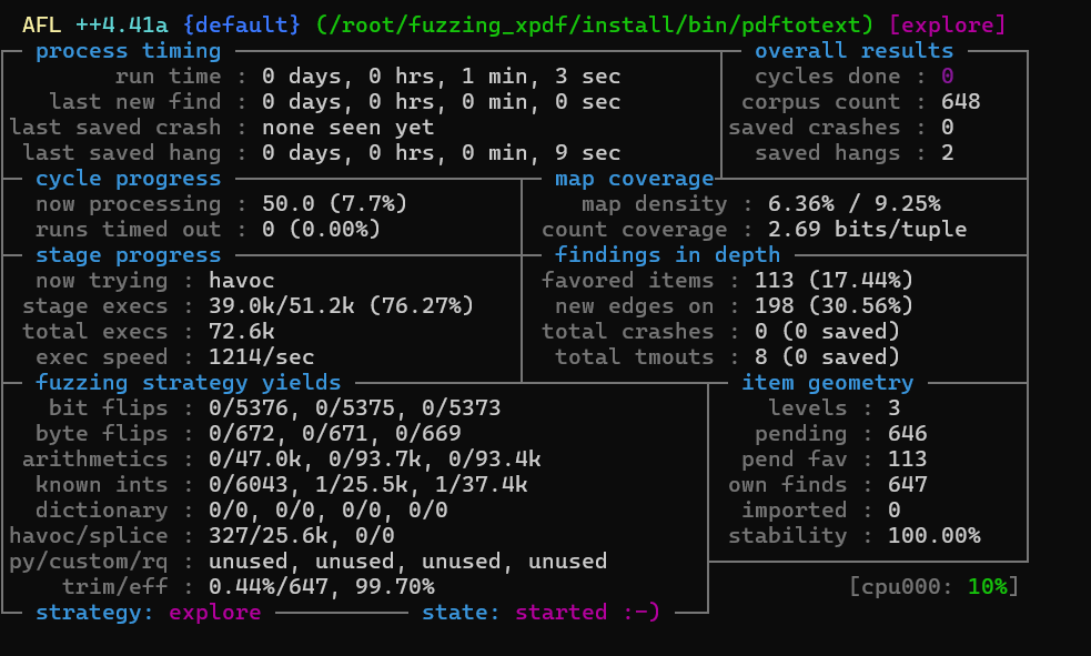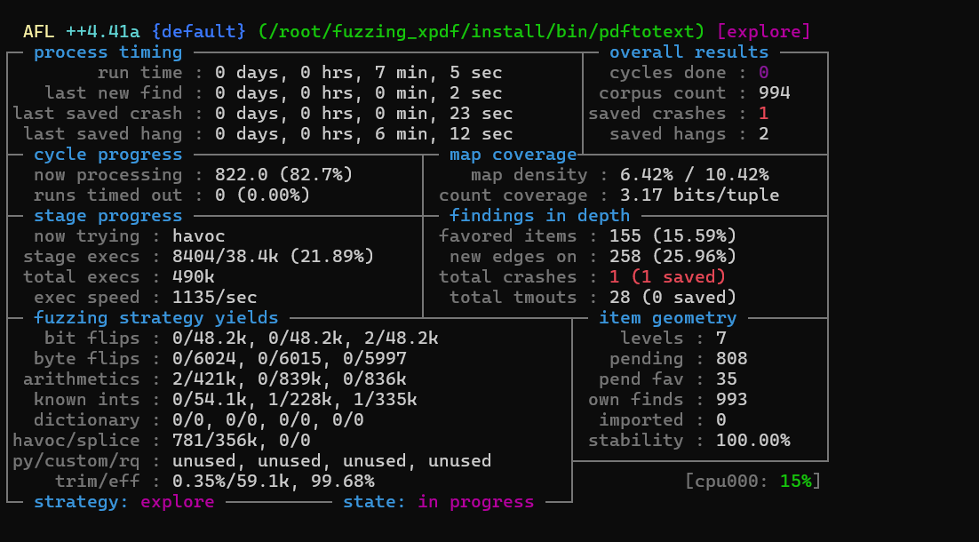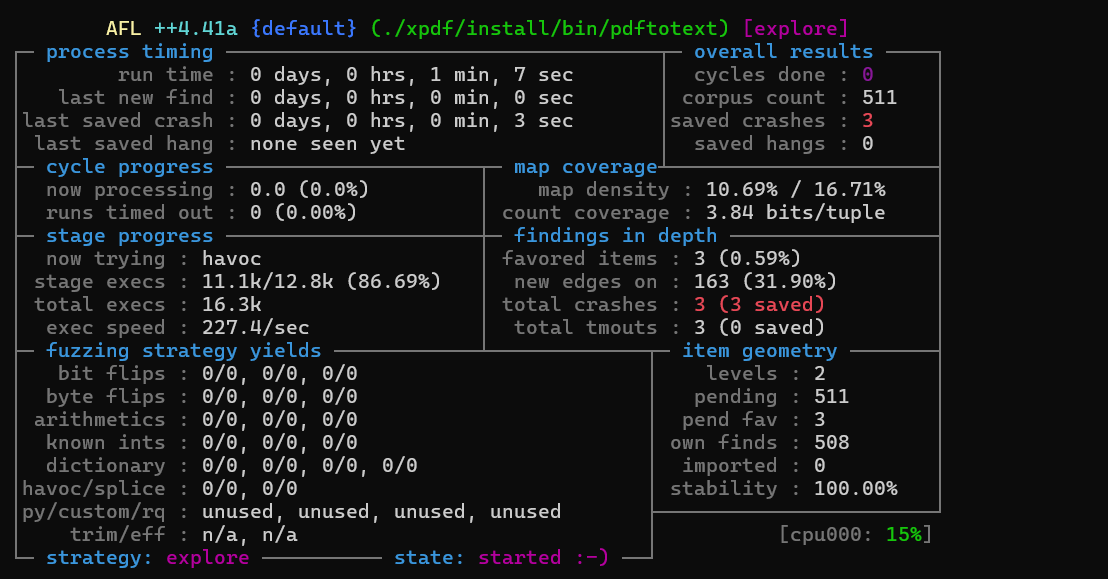 因为教程中后面两个示例pdf都404了, 这里我们的初始语料库就只能有一个pdf. 可以非常直观的看到语料库对fuzz的影响.