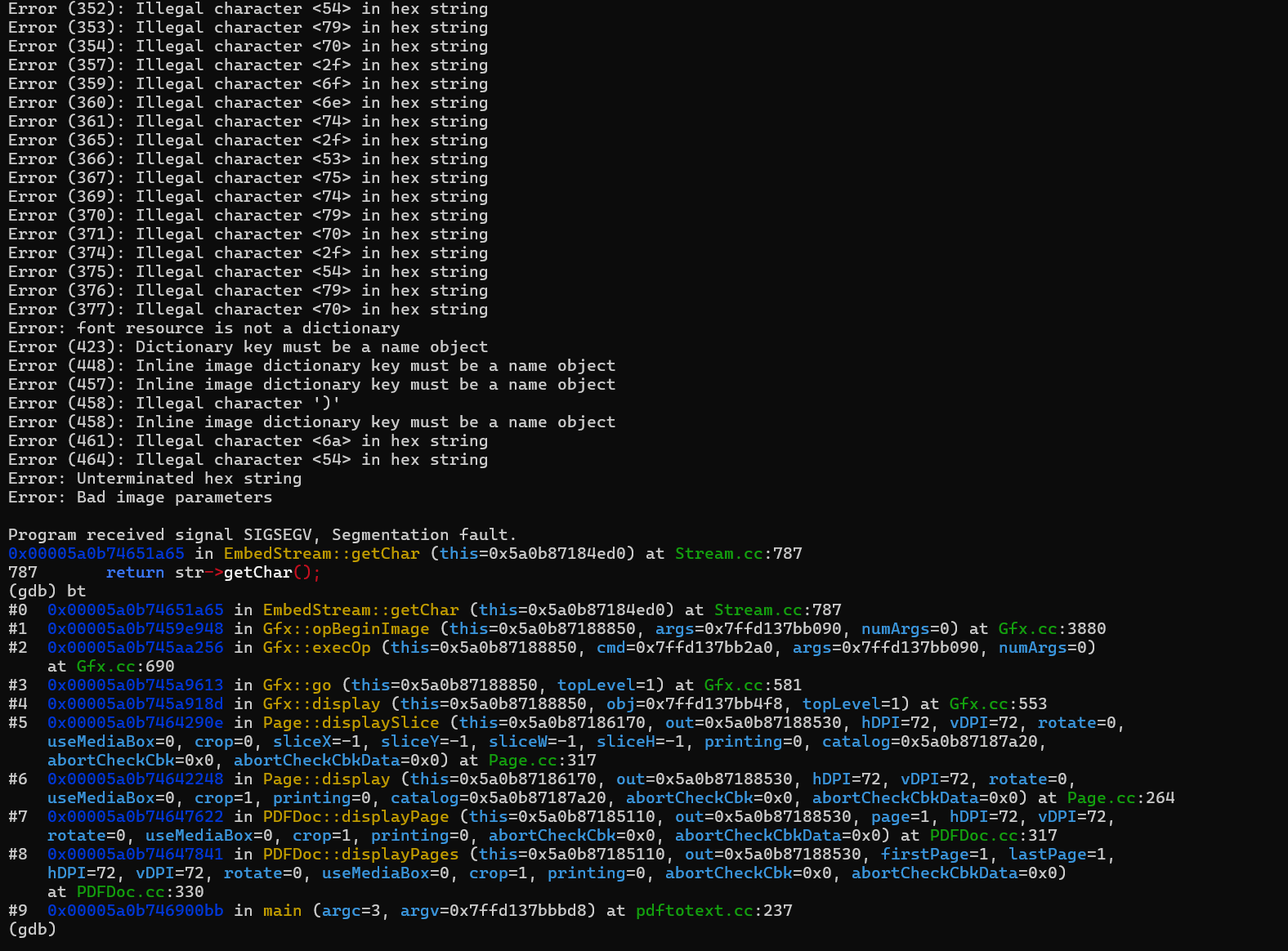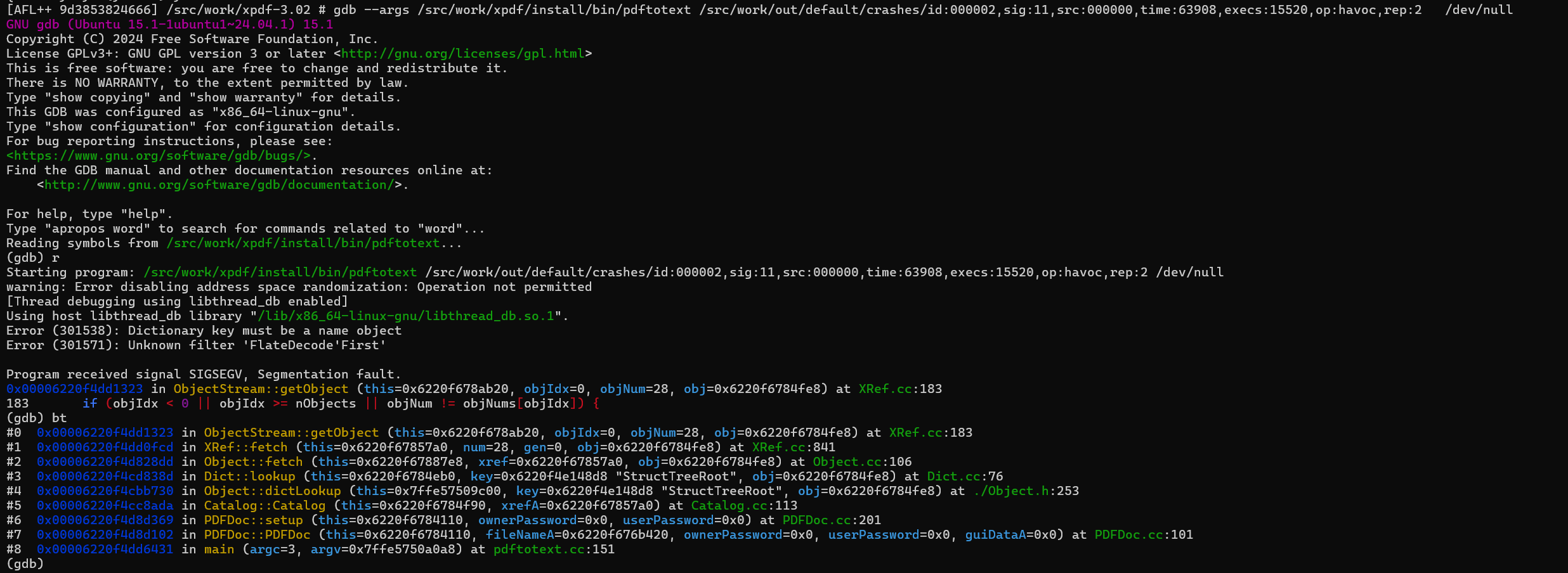 gdb --args /src/work/xpdf/install/bin/pdftotext /src/work/out/default/crashes/id:000001,sig:11,src:000000,time:35363,execs:8962,op:havoc,rep:1 /dev/null |